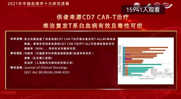 “供者來源CD7 CAR-T治療難治復發T系白血病有效且毒性可控”被評為“2021年中國血液學十大研究進展”之一。這一研究進展的技術關鍵在于采用雅科生物科技發展的Intrablock技術進行的CD7 CAR-T細胞治療可以克服自殺現象有效地制備CAR-T細胞。同時,研究結果表明,回輸后CD7 CAR-T細胞可以在體內長期存在從而達到最佳的療效。另一方面,在臨床試驗的設計上采用供者來源的正常T細胞制備CD7 CAR-T也為這一國際矚目的研究成果起到了關鍵作用。