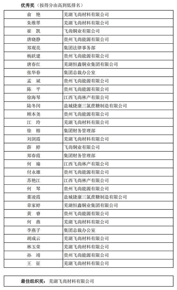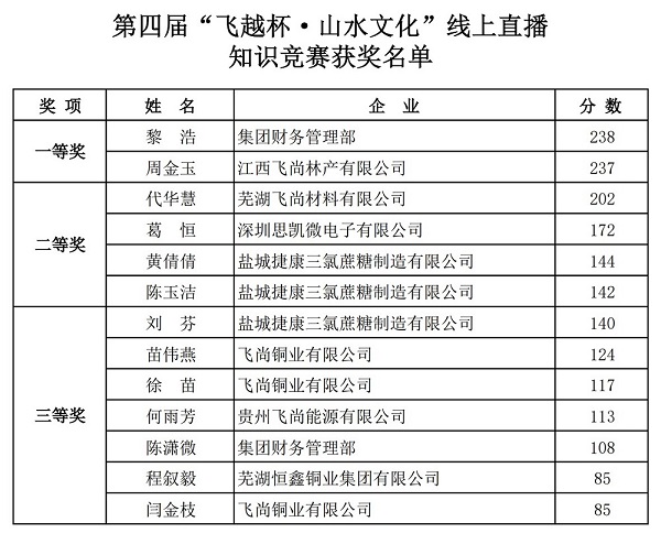 1月13日晚,飛尚集團第四屆“飛越杯·山水文化”線上直播知識競賽正式結束。根據競賽規則,統計所有參賽者的最終得分,飛尚集團財務管理部黎浩、江西飛尚林產有限公司周金玉分別以238分、237分的成績獲得一等獎,蕪湖飛尚材料有限公司獲得最佳組織獎。