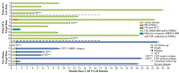 CD7 CAR T細(xì)胞是一種新型的癌癥免疫治療方法,它可以通過基因修飾T細(xì)胞使其能夠識(shí)別和攻擊表達(dá)CD7的癌細(xì)胞,在治療CD7陽(yáng)性的T細(xì)胞惡性腫瘤和急性髓系白血病(AML)上具有很大的潛力。在先前的一項(xiàng)I期試驗(yàn)報(bào)告中,供體來源的CD7定向嵌合抗原受體(CAR)T細(xì)胞在難治或復(fù)發(fā)的T細(xì)胞急性淋巴細(xì)胞白血病(r/r T-ALL)患者中顯示出可行性和早期療效2。在此,我們報(bào)告了該療法在2年隨訪后的長(zhǎng)期安全性和療效。