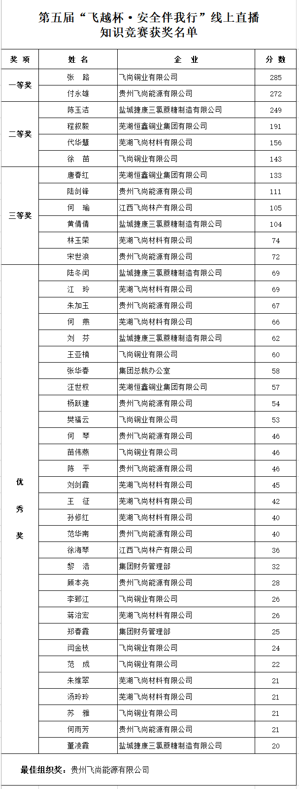 12月28日晚,飛尚集團第五屆“飛越杯·安全伴我行”線上直播知識競賽正式結束。根據競賽規則,統計所有參賽者的最終得分,共59名參賽者取得競賽分數,其中飛尚銅業有限公司張路、貴州飛尚能源有限公司付永雄分別以285分、272分的成績獲得一等獎。貴州飛尚能源有限公司因得分總數第一、參賽人數第一,獲得最佳組織獎。