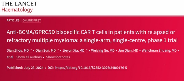 7月23日,采用上海雅科生物科技有限公司研發(fā)的BCMA/GPRC5D雙特異CAR-T細(xì)胞治療技術(shù) (YK-BCMA-GPRC5D BoomTM, YK-CAR-069),由徐州醫(yī)科大學(xué)血液病研究所醫(yī)療團(tuán)隊(duì)進(jìn)行I期臨床試驗(yàn)的研究成果在國(guó)際知名期刊發(fā)表:Anti-BCMA/GPRC5D bispecific CAR T cells in patients with relapsed or refractory multiple myeloma: a single-arm, phase 1 trial, The Lancet Haematology (Impact factor: 15.4)。徐州醫(yī)科大學(xué)血液病研究所徐開(kāi)林教授、李振宇教授,復(fù)旦大學(xué)生命科學(xué)學(xué)院兼職教授/上海雅科生物科技有限公司CEO張鴻聲教授為本文共同通訊作者,徐州醫(yī)科大學(xué)血液病研究所的周典博士、孫乾博士和夏潔云博士為文章的共同一作。