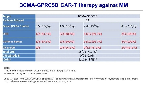同時(shí),本次臨床試驗(yàn)也證明了BCMA/GPRC5D 雙特異CAR-T細(xì)胞治療的安全性。在21例患者中,細(xì)胞因子釋放綜合征(CRS)發(fā)生率為71%,且均為1級(jí)或2級(jí)CRS;僅1例回輸劑量為最大耐受劑量4 x 106/kg的患者發(fā)生1級(jí)ICANS,回輸劑量在最大耐受劑量以下的患者中,均未觀察到ICANS或3級(jí)以上細(xì)胞毒性。