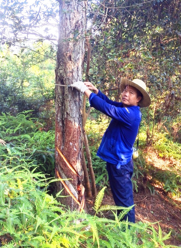 每年夏季是松樹高產脂旺季,每年的采脂開刀從“立夏”開始,跨越整個夏季。每個采脂工人每年采割林木數量約6000株,每棵松樹的采割刀數要達到35刀及以上。每個采脂工人每天采割林木數量約2000株,有人曾計算過,采脂工人每天在林地中步行數量不少于40000步,也就是不少于20000米,這每天步行20000多米啊,可不是在林蔭小道悠閑地散步,不是在花前月下享受著浪漫,而是頭頂烈日,腳踏荊棘。